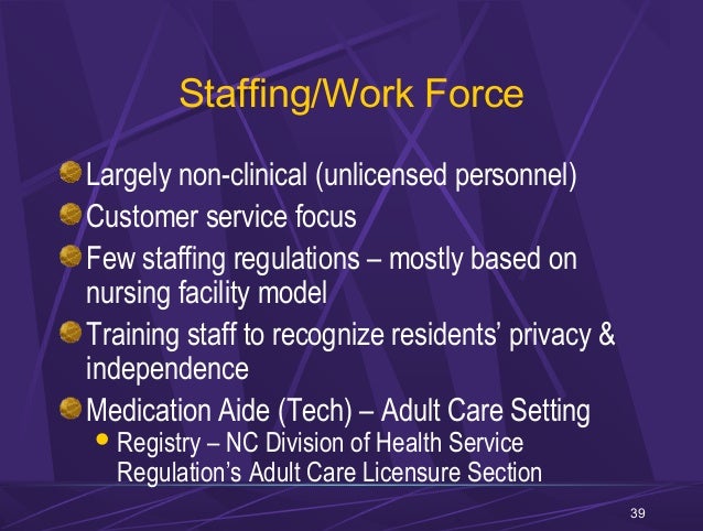 Compendium of Residential Care and Assisted Living Regulations and Policy: 2015 Edition. NORTH CAROLINA . Licensure Terms . Assisted Living Residences . General Approach . housing with services facilities. The North Carolina Division of Health Service Regulation licenses ACHs based on ... Access Content